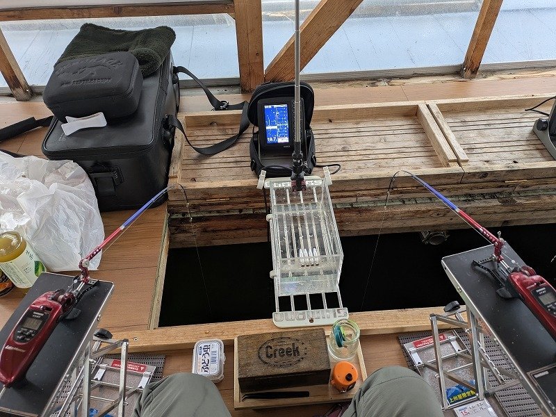 前回4日の反省点もふまえつつ、はじめから寄せの為に「ブドウ虫」を上に付けてスタート!なにせワカサギ群れの回遊が静かで・・まぁ~外道も釣れていないからまずは「寄せる」に専念!
