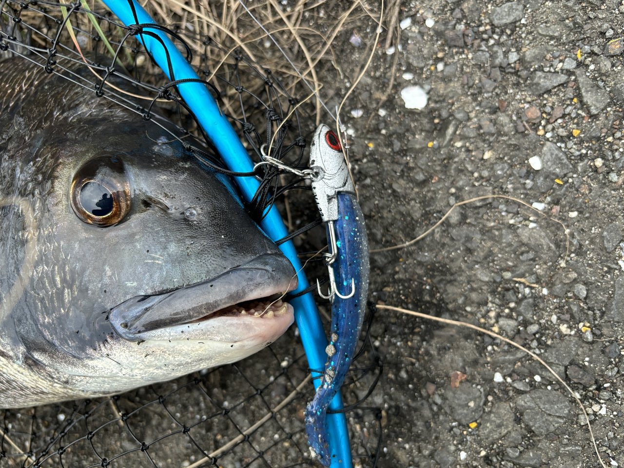 スタッフ高橋で~す!近郊ベイエリアでデイシーバスゲーム!今回は夕マズメ狙い。16時より開始して早速シーバスのチェイスあり!喰わんのかい・・場を荒らさない様、隣のストラクチャーへ移動すると、クロダイが沢山いてはります・・ルアーを通してみますと、興味は示すが追うまでにはいかず。再びシーバスのいるポイントを攻めると、足元まで帰ってきたローリングベイトをピックアップ中にチーバスが襲い掛かり、そのままフッキング成功です。今度はクロダイポイントを攻めます。ストラクチャーを超タイトに狙うと・・喰った!強引にリールを巻いて障害物から離し、最後は岸壁の際に潜るのをいなしてネットイン完了!カッコイイクロダイデス~!VJ22を喰ってくれましたよ!17時に終了!小1時間ほどの釣りでした。