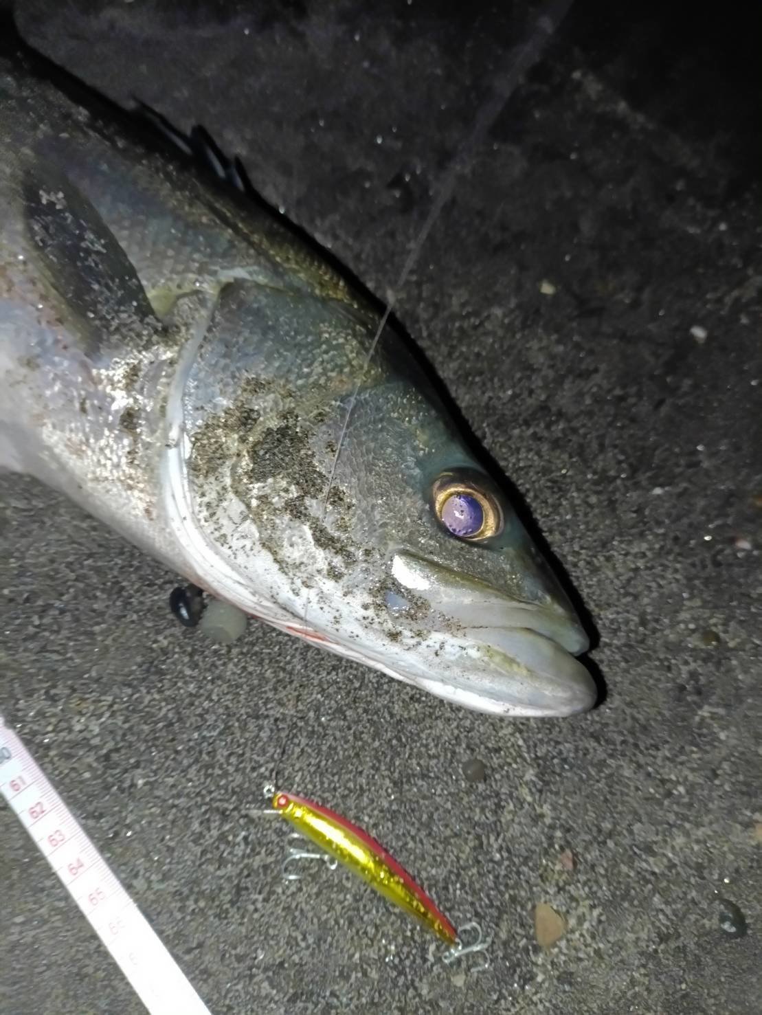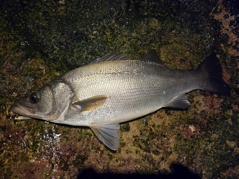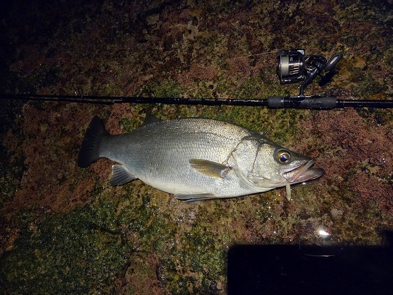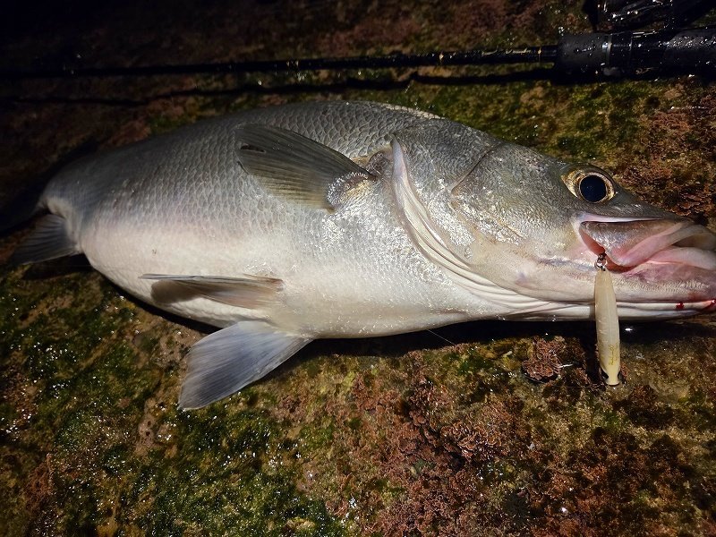 周辺は浅いので根だらけ・・・しかし、これはバラシたくない!!無我夢中で取り込み何とかランディング成功!ライト装備で、これは来ちゃダメ的な70センチアップのヒラスズキでした。