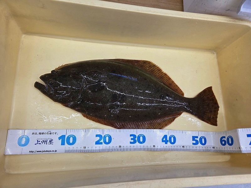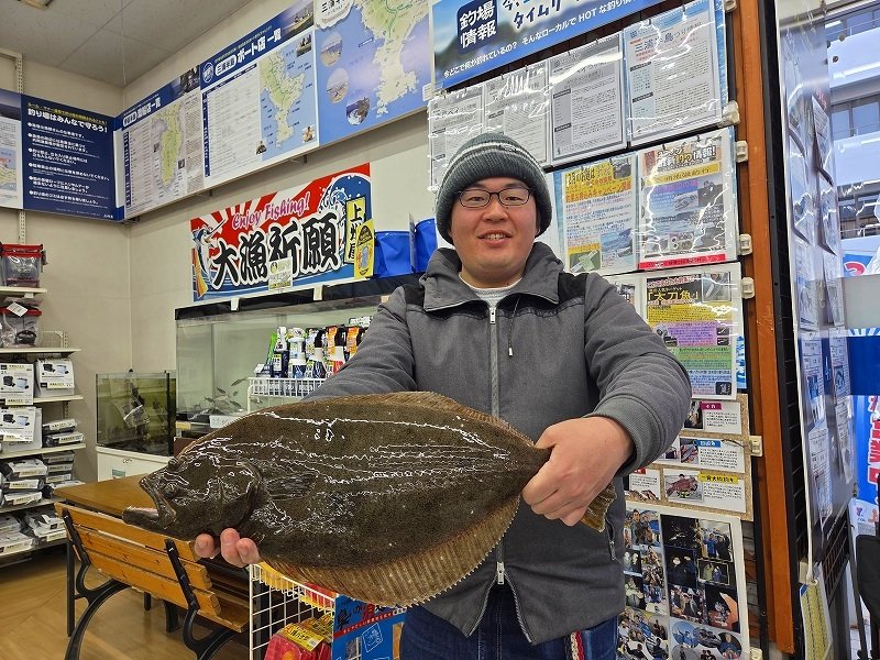【横須賀うみかぜ公園】横岸壁最新釣果情報です。今日はヒラメデー!瀬谷区からお越しの遠藤様がカレイを狙っていたら、57センチのヒラメが釣れたそうでお持込み頂きました^^おめでとうございます!!