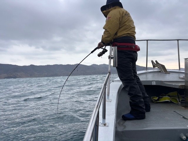 早速釣りスタート!水深70m前後なので、まずは定番の鉄ジグスイムライダー200g(グローヘッド)からスタート・・・魚探の反応は良いとの事、数回落としてシャクってるどドン!ヒット~まずは船中ファーストヒット・・・なぜか?ここで普通にイナダって(隣もイナダ)リリース
