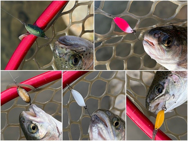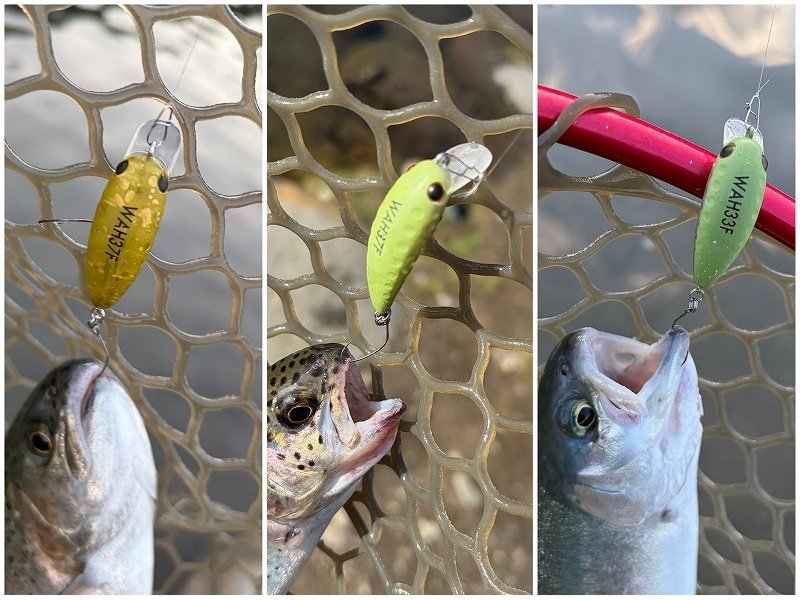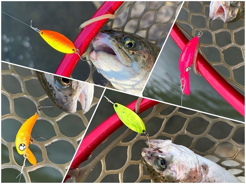■竿:999.9マイスター60UL、ホワイトウルフ60UL他 ■リール:プレッソ2004、旧プレッソ1003他 ■ルアー:リクーゼ1.7g、スイッチバックスプーン1.2g、ペンタ1.3g、ちびパニクラSR・DR、団子魚、ぷちモカSS 他