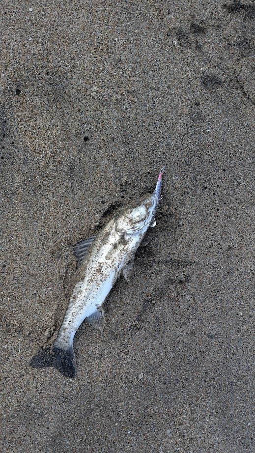 日川浜にサーフに行ってきました!!当日は北風がやや強くの予報、ポイントに到着するとやや波も高く風も左方向から右に吹いており、正面に投げたルアーが風に引っ張られたラインによって右から帰ってくる状況でした。シンペンやワームで探るもボトムを感知する事が難しかった為、ジグを付けてポイントを探りに歩きまわりました・・・・途中、他のアングラーさんとお話をするとジグでソゲクラスを2枚上げたとの情報をいただきました。自分もポイントを転々と変えて探り、下げ潮が効き始めたお昼前に魚信を捉えアワセを入れると・・・ボラのスレ・・・その後も同様の場所でボトム付近を探ると明確なバイトが有り上がって来たのは、小型のニベ。その後も連続ヒットするが、セイゴ2本追加して終了となりました。見た目的にはベイトっ気は少ないですが、小型の魚は居る様子です。釣れた場所も手前のブレイクなので遠投をしなくても釣れるので、防寒対策を万全にサーフに行ってみてはいかがですか?詳しくはお気軽にスタッフ鈴木までお願いいたします。