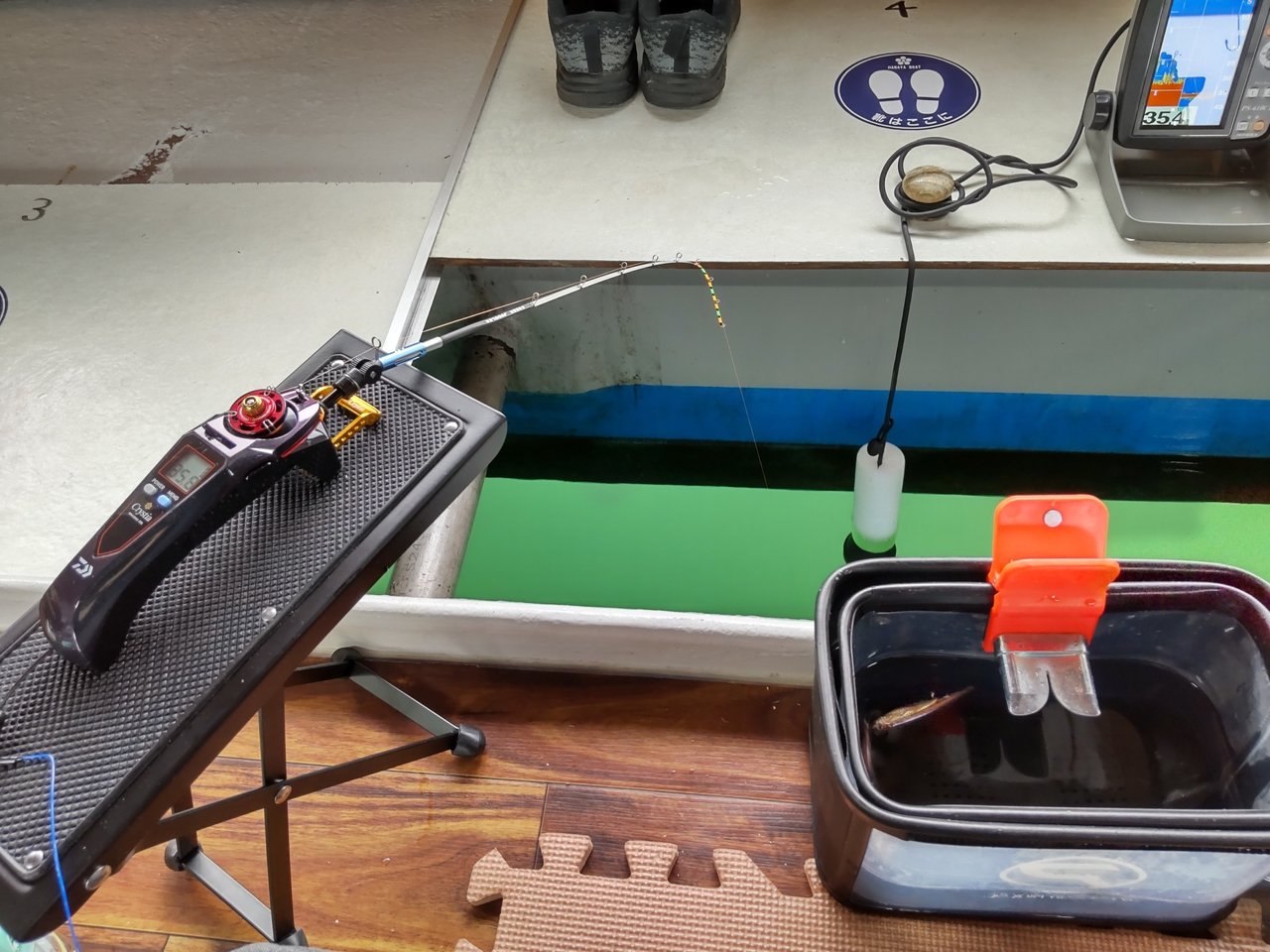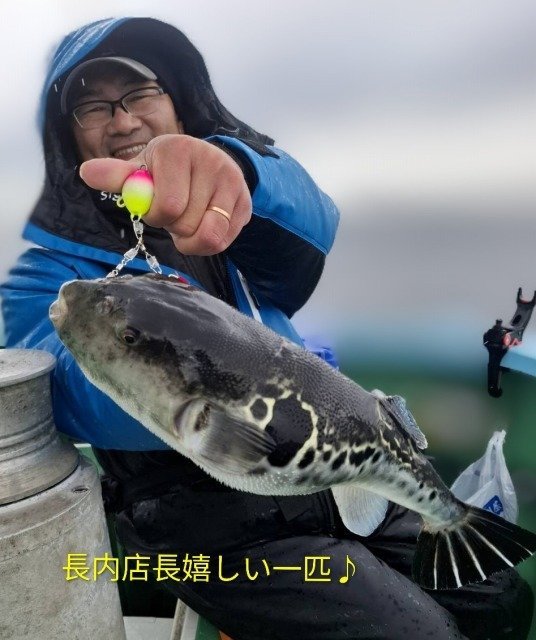 しばらくして長内店長にアタリがあるも喰い込まず、タナを聞くと底付近との事でしたので私もそこまで落としてトラフグ捜索に。