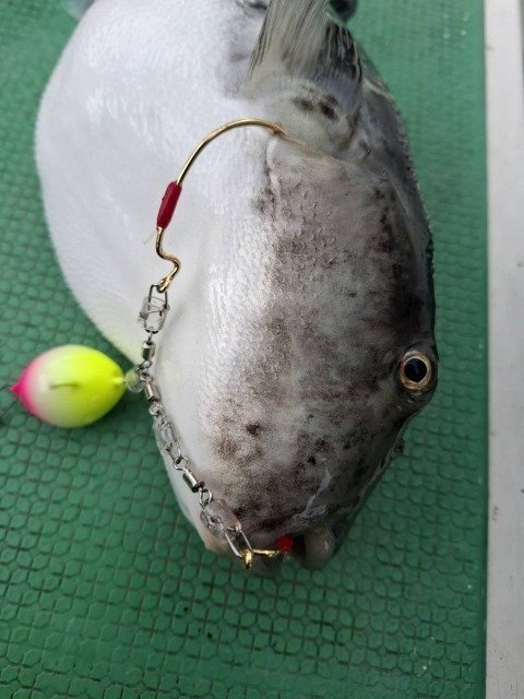 すぐに「グッ」と入るアタリが有ったのでアワセを入れると「ゴンッゴンッゴン」と気持ちの良い引き♪見事にネットイン出来たのは本命のトラフグで良型♪