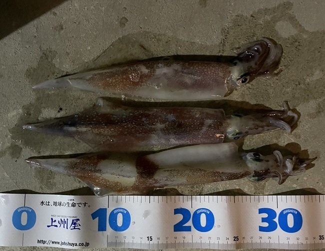 A氏、夜の敦賀の堤防へ1時間半ほどの釣行でヤリイカを3杯GET!!