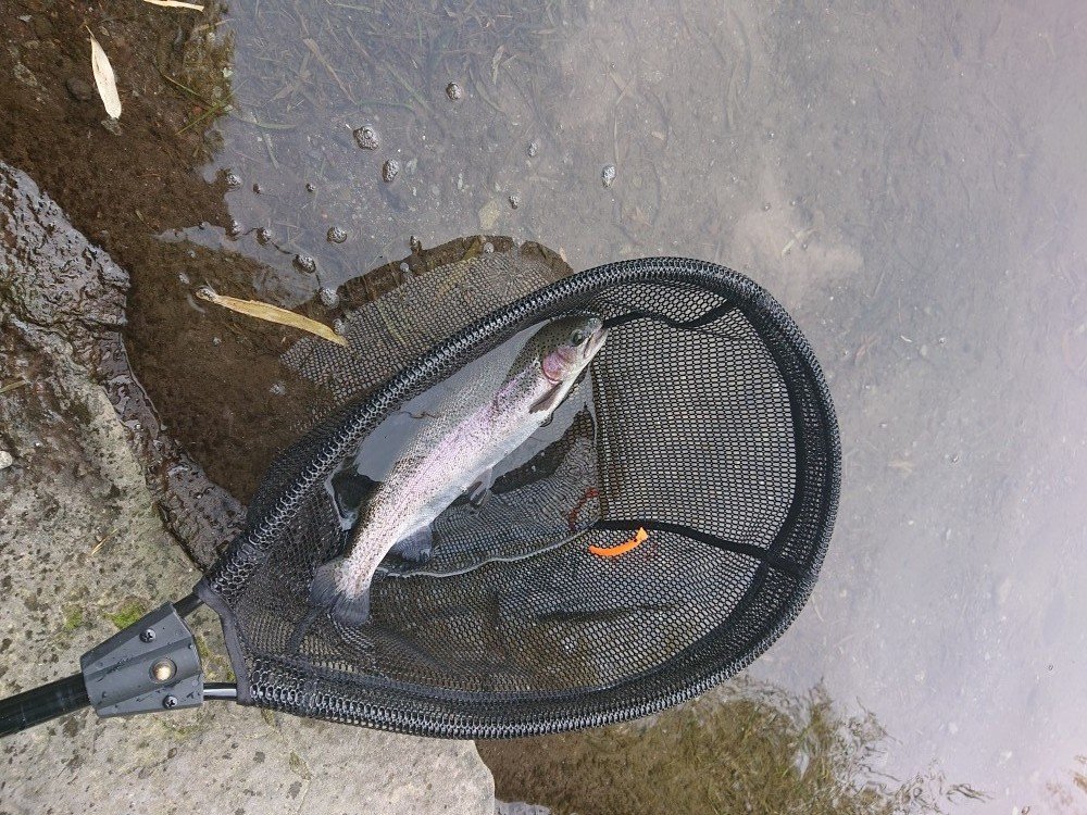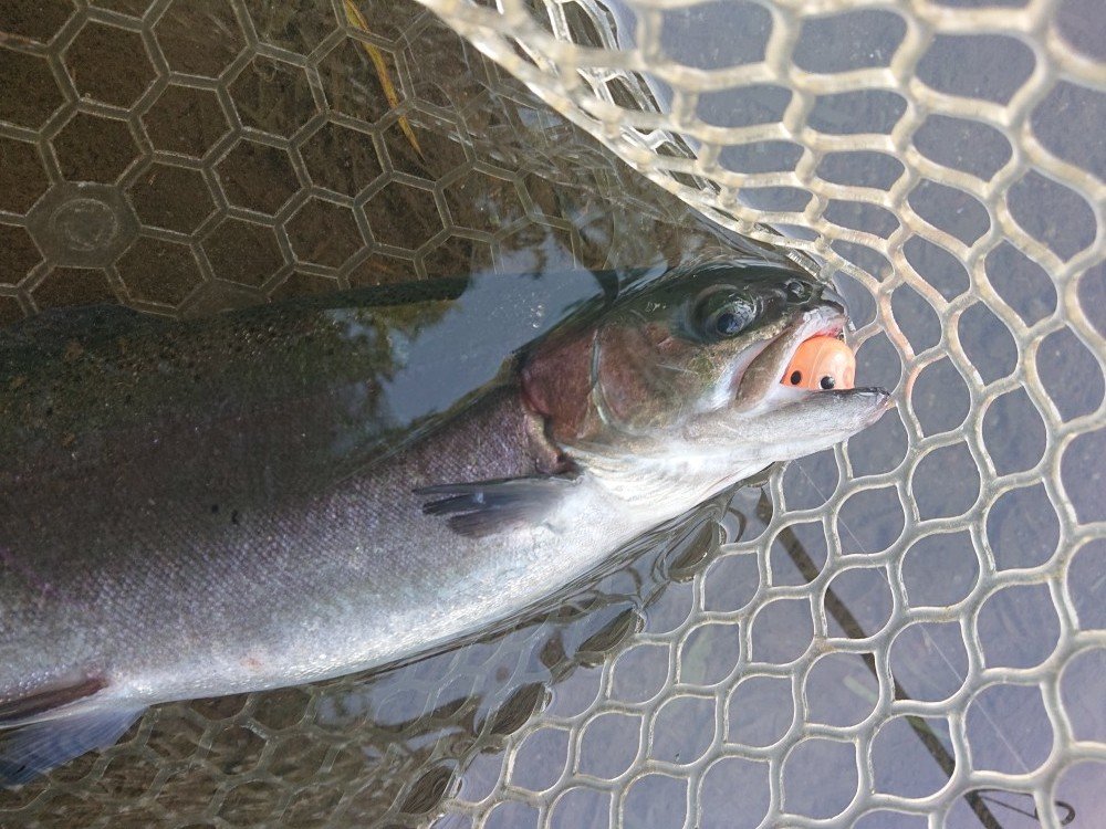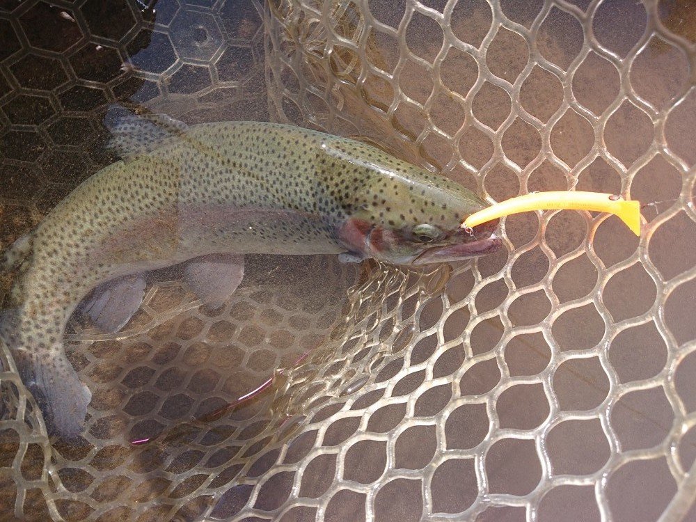 平日ですが、早朝よりたくさんの釣り人で賑わっており、今回は真ん中のポンドで釣りスタート。始めボトムを、Bスパーク・POGO・シャインライドナノで攻めると40cmクラスが連発しました。次に定番にょろ系でもポツポツ釣れているタイミングで、放流が有り、カルテラスのパラト・ティアロのオレキンでHIT!
