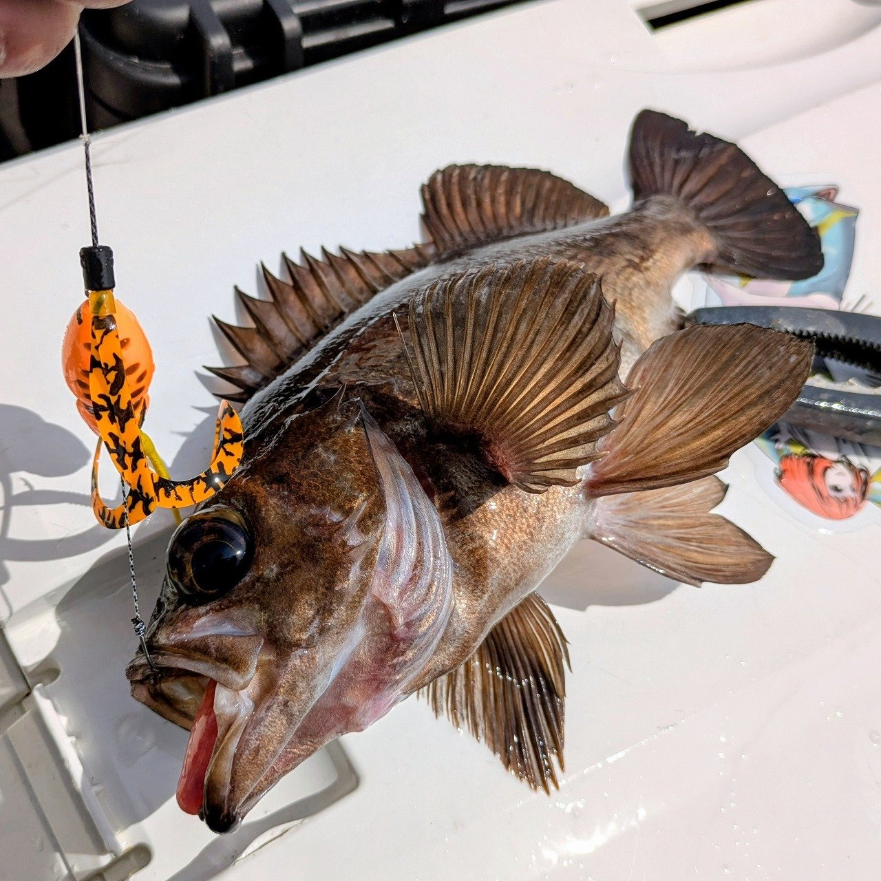 そして8投目。まだ釣っていない左のミヨシのお客様が釣り上げ残り1人・・・。ベイトの反応も薄くなってきて厳しい中でのラスト1投・・・。残念ながらコウジンのアタリは無く、私がキチジを釣って終わりました。