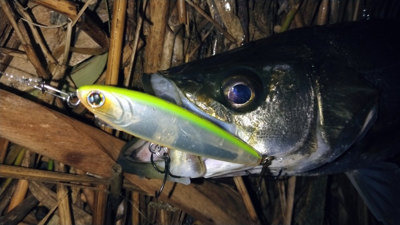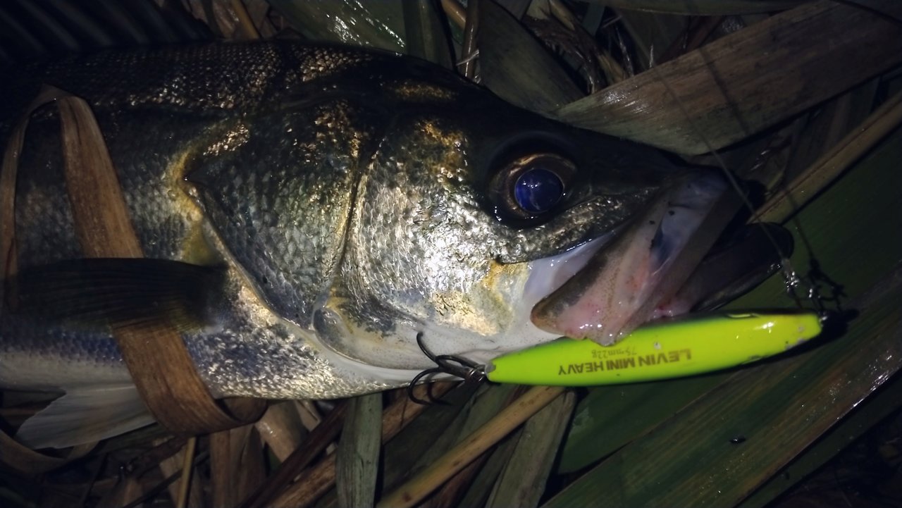 ポイント到着時、先日ご一緒した先行者さんと挨拶。ゴミが多めとのことでポイント移動するらしい。入れかわりで入る感じになる。確かにゴミ多く、流れも若干上げている程度。濁りは思ったよりもなく、風もなく水面はベタ。とりあえず手前をミノー系、ロリベでレンジを落としながら探っていくが、いかんせんルアーがまっすぐ戻ってくるレベルの流れ。少しは沖のすじのほうが強いか?と、手前の根を考慮して、浮き上がらせやすいグリード30gで、真ん中先の筋、暗部の奥に入れてボトムを取る。その後デッドスローから、軽めなリフトを入れつつ数回、そろそろ回収の浮き上がりにはいらせないと、ヤバイかな?ってタイミングにドスっ!っと抑え込むバイトっ♪♪とりあえず一気に浮かせる。頭、口のサイズから余裕の60UPと思えど、案の定、根に擦られて根掛りに変わる。。。リーダー先で切れてロスト。やはりこの根はネックだ。と改めて実感。その後も手前に流れが入らず、仕方なく、流れが効いている沖の筋を今度は上のレンジで!レビンminiヘビーを真ん中先の暗部に入れてチョットアクションを入れるとアッサリ45UP!と同様にすると連発っ♪♪45UP追加、同サイズバラシ、その後に55UPゲットっ♪♪それで流れがたるんみ反応が消えたので、時間も時間だったので撤収することに。たぶんレンジを落とせば、まだサカナ出せそうな感じでしたが、ロストが増えて終わるだけですので。。。