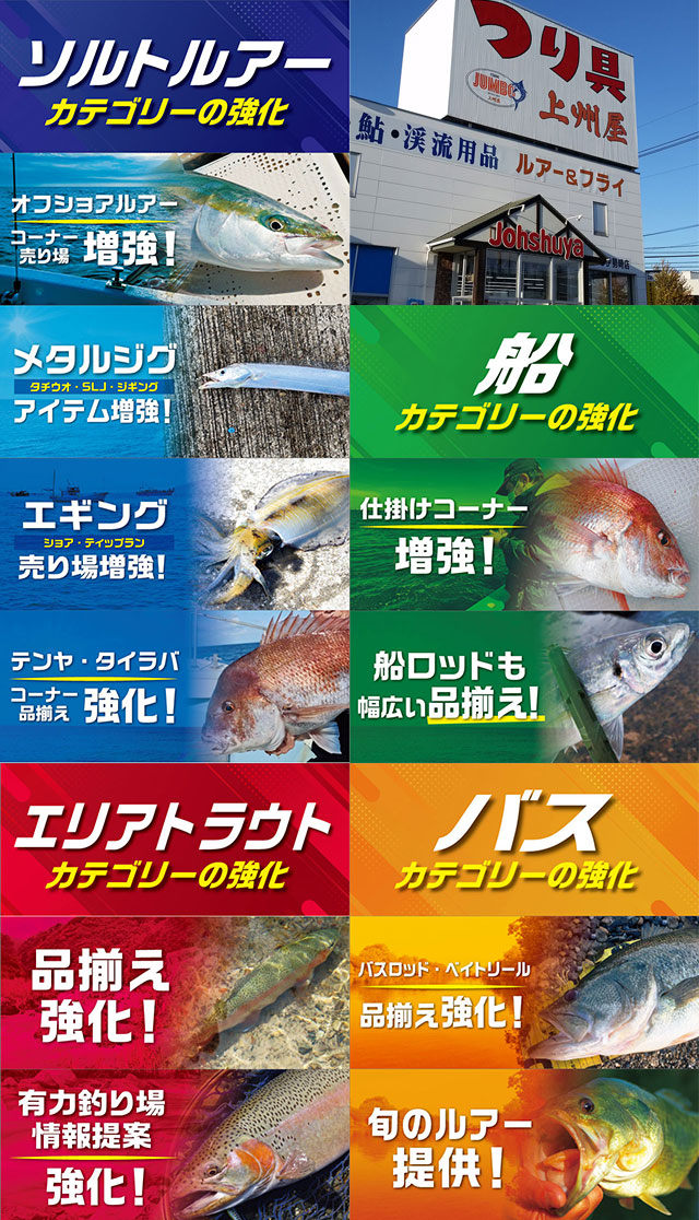 上州屋グループにて、新規オープンまたは改装リニューアルにより、扱い商品や店内品揃えetc.が大きく生まれ変わった店舗を紹介します!以前にまして地域密着・情報満載・買い物しやすい店舗で皆様のフィッシングライフをスタッフ一同サポートしてまいります。釣行の準備だけでなく、帰り道やお近くにお越しの際にはぜひお立ち寄りください。