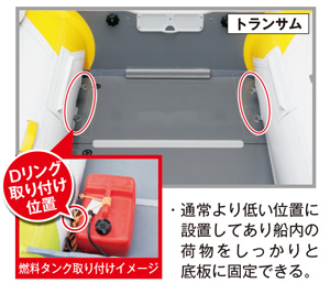 クーラーボックスや燃料タンク等、船内の荷物固定に役立つDリングを14個設置。通常より低い位置なので荷物をしっかりと底板に固定できます。
