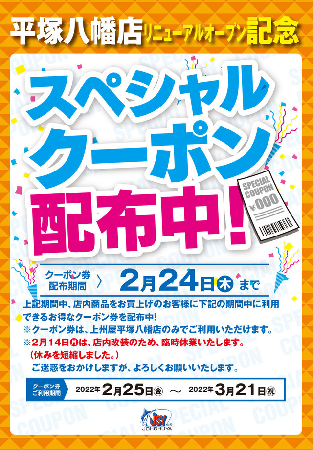 只今、上州屋平塚八幡店にて店内商品お買い上げのお客様に同店リニューアルオープン後(2月25日~3月21日)にご利用いただけるスペシャルクーポン配布中!