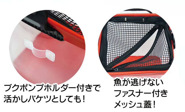ブクブクポンプホルダー付きで活かしバケツとしても!魚が逃げないファスナー付きメッシュ蓋。