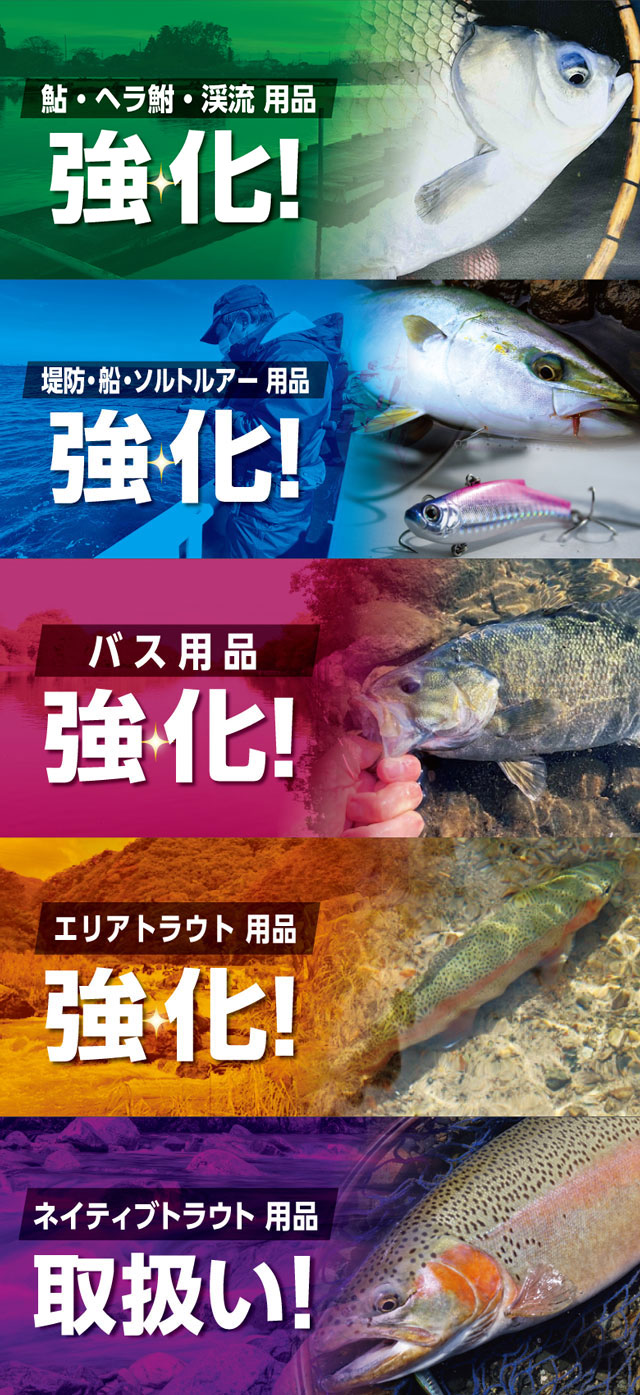 鮎・へら鮒・渓流用品強化!堤防・船・ソルトルアー用品強化!バス用品強化!エリアトラウト用品強化!ネイティブトラウト用品取り扱い!地域密着&充実の品揃えで皆様の釣りを応援いたします!