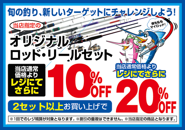 9月20日(土)からのセール期間中、シマノ、ダイワなど当店指定のロッド&リールが、店内在庫限り当店通常価格よりレジにてさらに10%OFF!