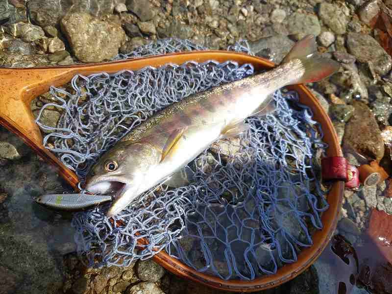朝一から葉鹿橋から下流にかけて攻めましたがなかなかアタリが来ない時間が過ぎて行きましたが、10時前、待望のアタリ。流れがやや急な瀬でのやり取りで慎重にネットイン!40cmの今季、放流された降海型ヤマメのオウライドリームと思われるトラウトでした。体高がなかなか有って良く引きました。