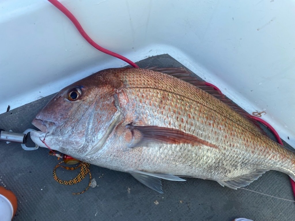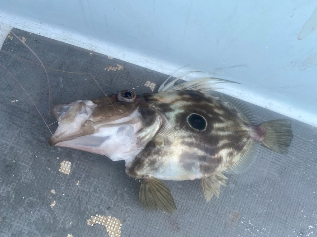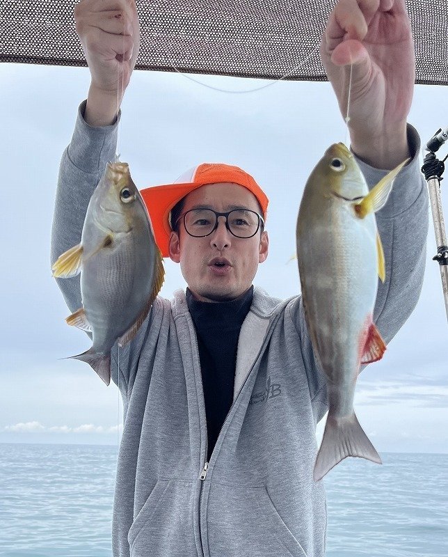 大型狙いでジャッカルキングカーリーの出番です。アタリが出るが離してしまい上手く乗せられません。その後ボトムタッチして5mくらいで大型マダイをキャッチしました。その後に竿を変えてアマダイエサ釣りに変更。天秤40cmに80号のオモリ自作アマダイ仕掛けで試してみましたがアタリがありません。エサはホタルイカ・オキアミにしましたが駄目でした。エサで釣れてのはマトウダイだけでした。その後潮が速くなりボトムが取れなく...。パラシュートアンカーで潮の流れを受けていましたが釣れず。タイラバに戻してレンコダイがポツポツで今回は終了でした。