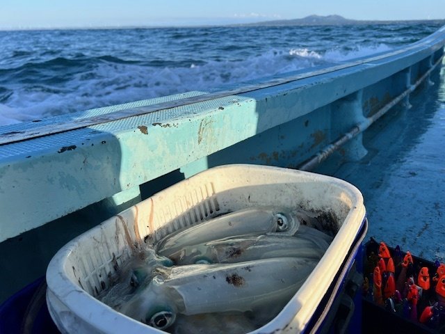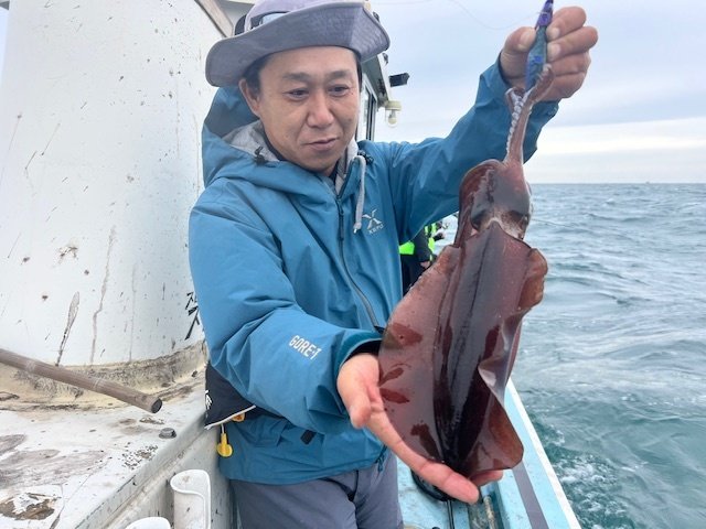 予報がハズレ、東の風10m以上でしたが強行してきました!案の定、流れは速いしウネリは強いしで、いい釣りはできませんでした。船中40杯ほど、個人釣果は13杯とかなり厳しい内容となりました。船長曰く、ここ数日の冷え込みで水温が低下しているのも釣れない原因のようです。それでも、お客様が胴長25cmを釣るなど、アベレージがデカいのはこの時期ならでは。胴20cmを超えてくると、乗った瞬間の重量感は病みつきになりますね!この日はエギよりも、シンカーのウエイト調整やマメな入れ直し、シャクリ方などで反応が変わりました。行くたびに状況が変わるので毎回違った発見があって、そこもまた楽しい所ですね!荒れる日が多くなるので出れる日も少なくなりそうですが、後半戦も楽しみたいと思います!