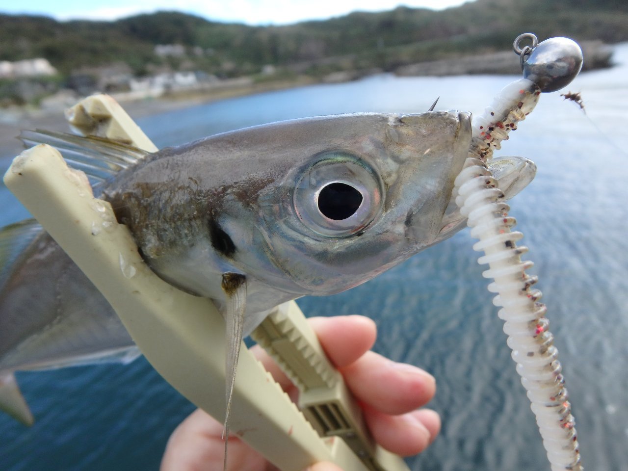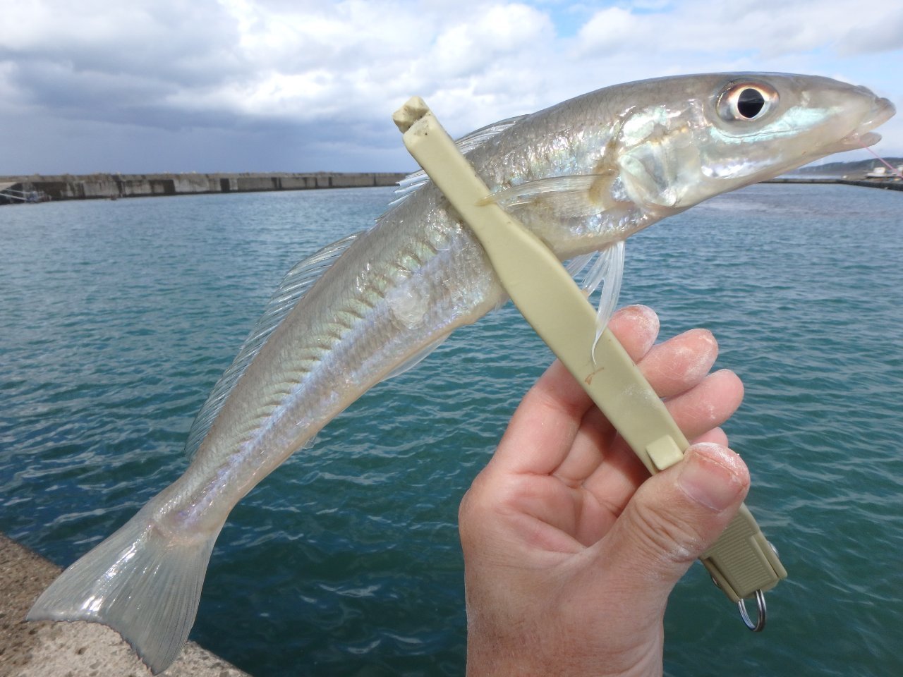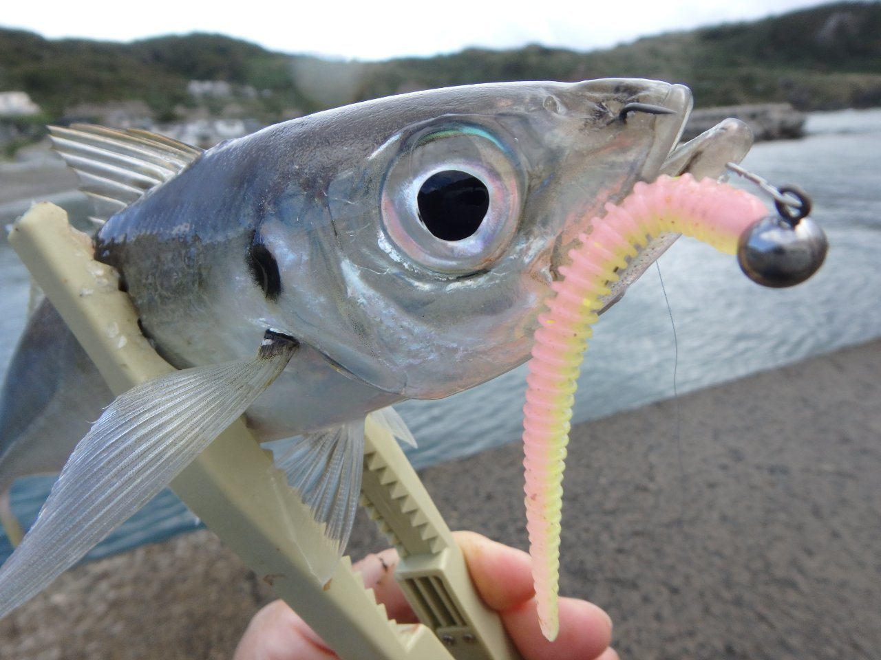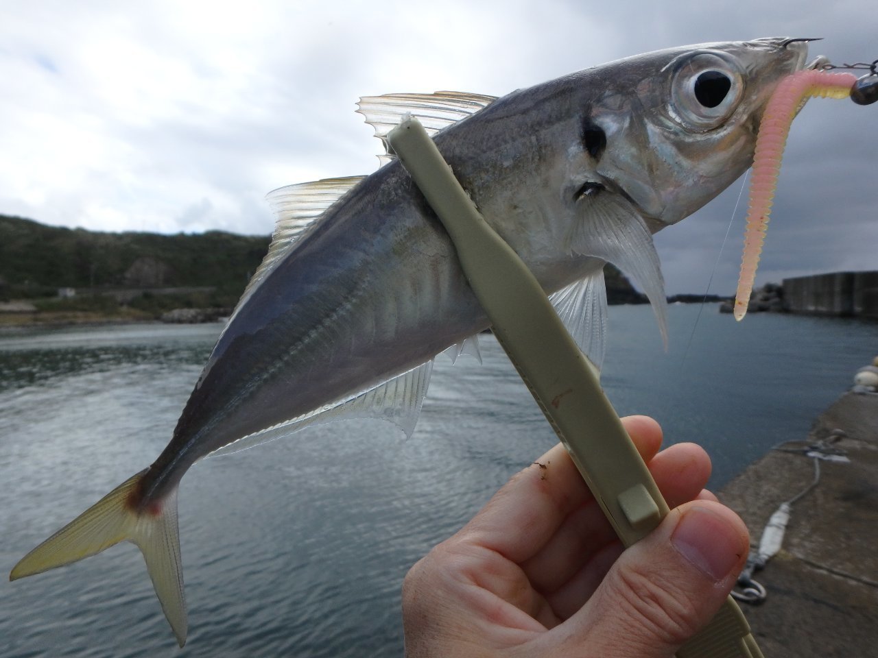 まずはアジング、強風でラインがあおられ1gヘッドが飛ばずアタリが取れずで少しずつ重さUP