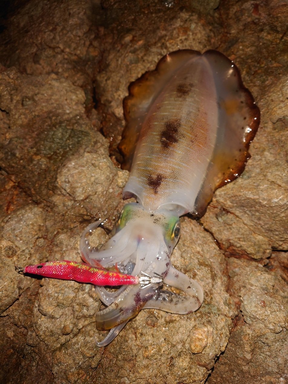 前回の釣行のイメージでカウント60秒+フリーフォールで探ります。こんな新月周りの真っ暗な時は【夜光のエギとラトル】が効果的!エギをしっかりと蓄光させて狙っていくと早い段階で1杯HIT!同じパターンで狙った2杯目はアワセた瞬間からズッシリとした手応え&ジェット噴射!絶対抜けないサイズだったので磯にズリ上げてキャッチしたこのアオリイカは後の計測で胴長25㎝のグッドサイズ!