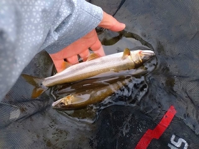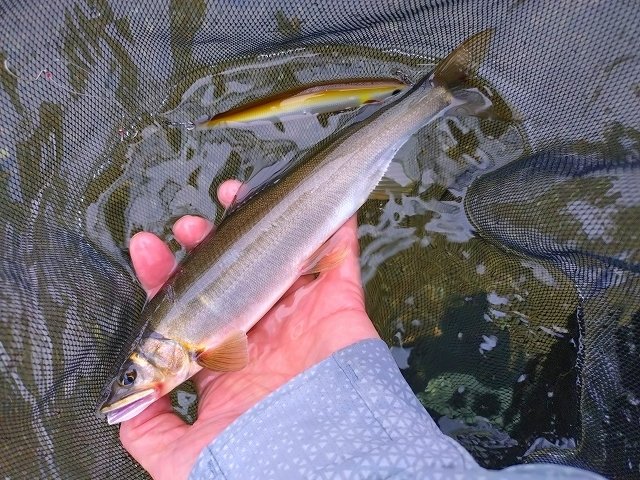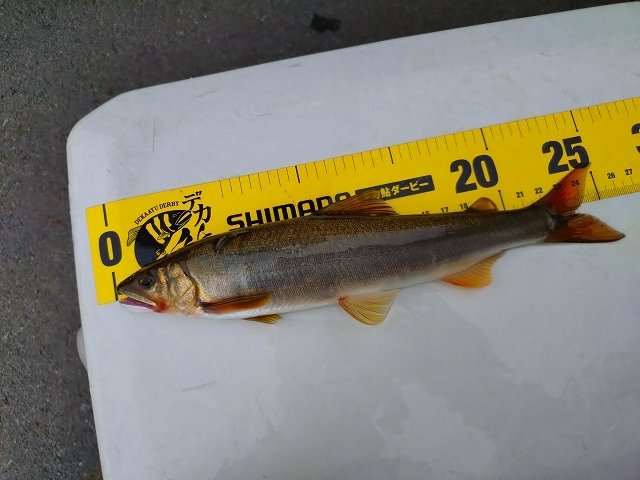 また狩野川本流に鮎ルアー釣行。他のポイントも見ましたが状況は神島橋下流が良い様子。結局前回と同じ午後3時前より釣り開始。反応の有る流れの筋が変わっていましたが22cm・18cmとキャッチ。とここで今期一番の引き!慎重に寄せてきますが途中で痛恨のバラシ。これはいかんと錨針から大型の身切れに備えチラシ仕掛に変更です。次の魚はさらに強い引きでしたが大型チラシ針の高い保持力で安心のやり取り。25.5cmの良型の取り込みに成功しました。神島橋下流は石もピカピカに磨かれてとても良い状態です。