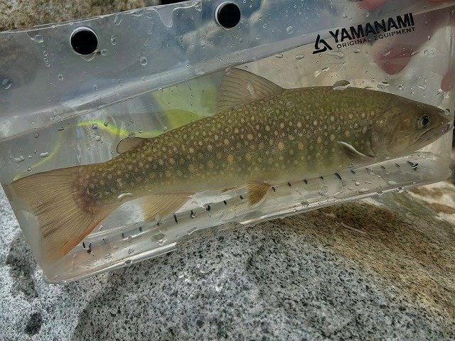 ゲリラ豪雨に遭遇しながらも良型イワナを釣り上げたばりさん。さすがですね。