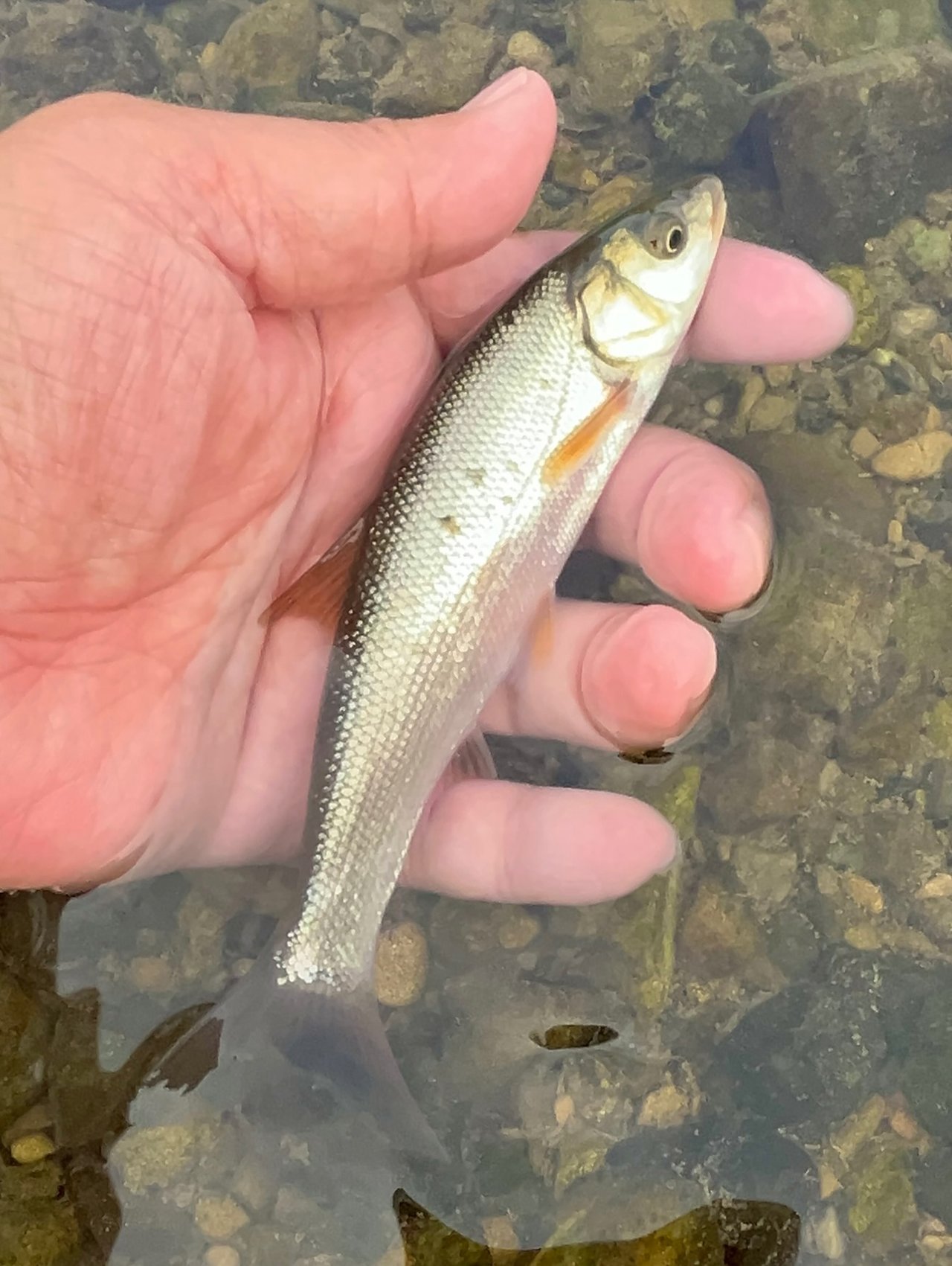 釣りの方はというと、番長と呼ばれる婚姻色オイカワのピークは過ぎましたが、番長候補の良型オイカワや良型カワムツの反応が良く、充分楽しめます。ドライフライでは小型のカワムツがとても良く反応してくれます。流速のある厚い流れではスウィングが有効です。良型は速い瀬の中に着いていますよ。