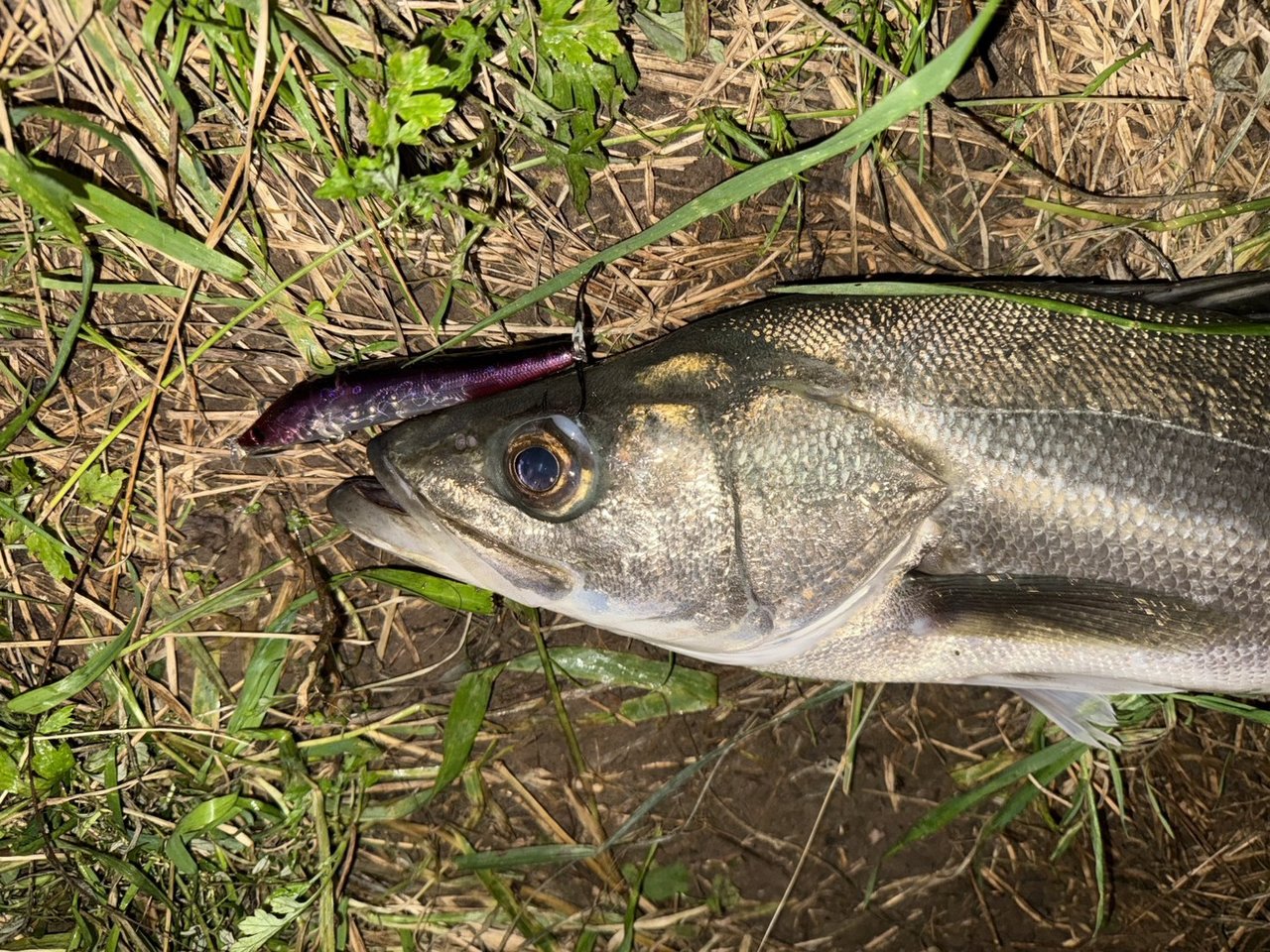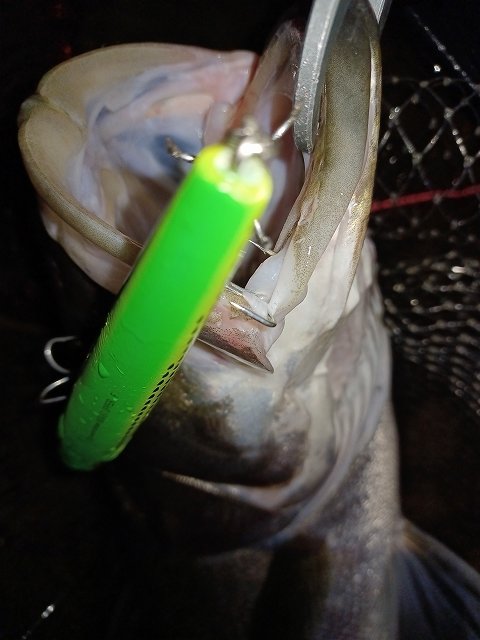 その後はエルドール115Fのナイトライドパープルでのエルジャークにシーバス45cm。その後70cmクラスがヒットしましたが足元まで寄せてフックアウト。最後にガックリでしたw