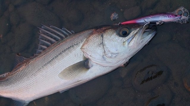 まずはエルドール115Fのナイトライドパープルから。ピッチ速めのエルジャークで、ルアーを弾かないように探っていると70cmのシーバスがヒット!