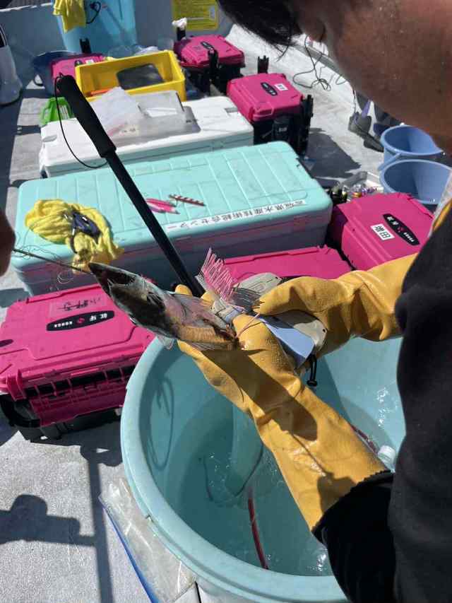 水産庁のお兄さんにタグを打ってもらいます。なるだけ弱らせない様に海水を汲んで手袋をしながら作業をします!!