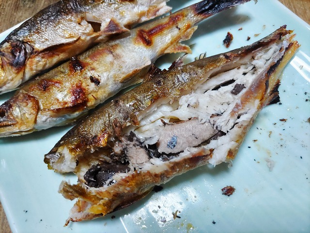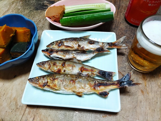 さて、晩酌は釣りたてのアユを塩焼きで!