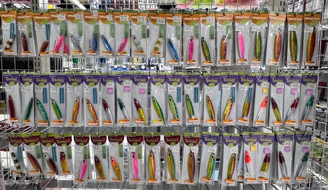 トリッカースリム60g・トリッカーⅡ55g75g95g・ウィークベイトショート60g80g100gが入荷。今年は潮が早い事が多く60gより重い所の出番が多いです。グロー・ピンク・緑金・赤金の定番カラーが入荷しております。