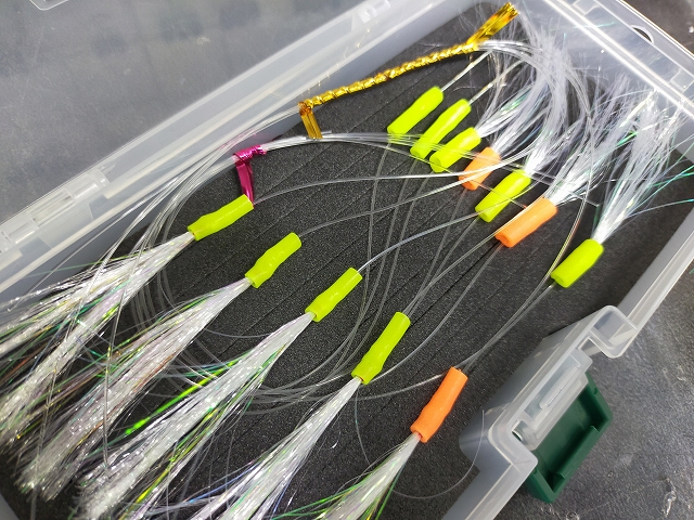 仕掛けは各船宿さんが推奨している逆テーパー仕掛け2/0の鈎にナイロンハリス12号15cm、上糸がフロロ4号230cm程付け合計約250cm。