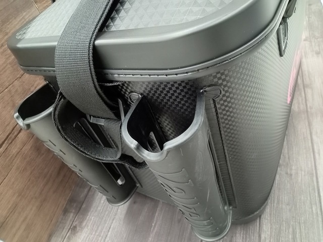 正面左側にはハードで型崩れしないロッドスタンド2基を、右側にはDカンを搭載し、ワレットや小物類を吊り下げることが可能。