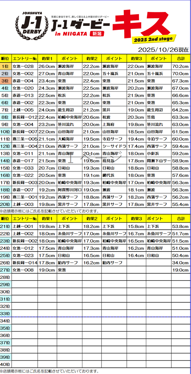 10/26(日)までにご登録いただいた方の順位表になります。