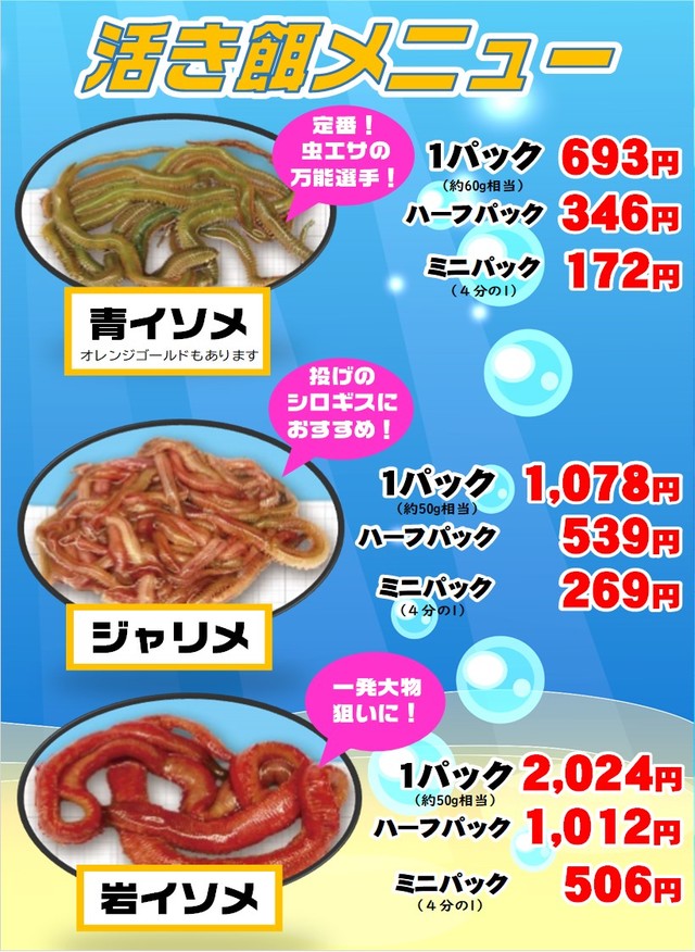 その他、ハゼやテナガエビにおすすめのマルキューハゼほたてや冷凍エサ各種、常温保存ができるサバレンジャーやアサリレンジャー、ポケベイト、パワーイソメも常備しております。