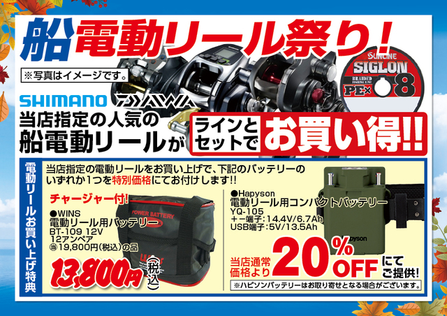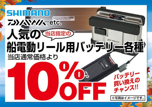 秋割10!! シマノ、ダイワetc.当店指定の船電動リール用バッテリー各種を当店通常価格より10%OFF!バッテリー買い替えのチャンスです!
