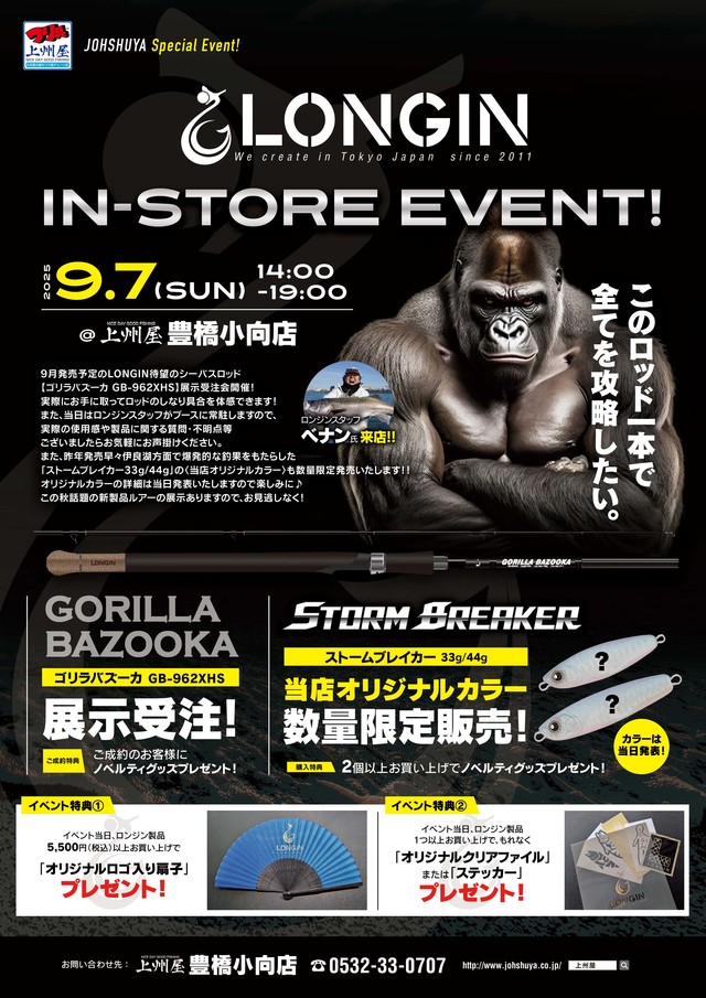 ロンジン初のロッド『ゴリラバズーカ』の受注会と当店オリジナルカラーの『ストームブレイカー』の販売、横浜フィッシングショーで即完売だった『スーパーレインボー』カラーも少量販売しております