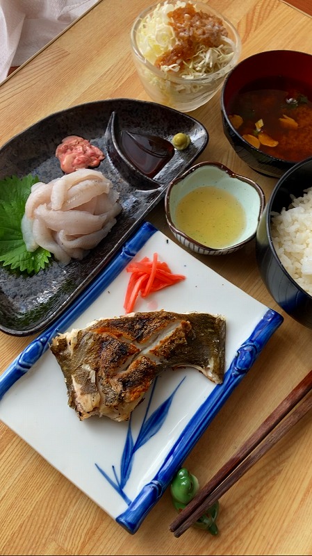 久々なので「お刺身」と前日釣った「ヒラメ」の塩焼きで昼食。