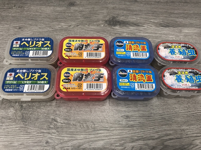 画像左より、ヘリオスL、釣女王、清流王、養殖虫ホワイト