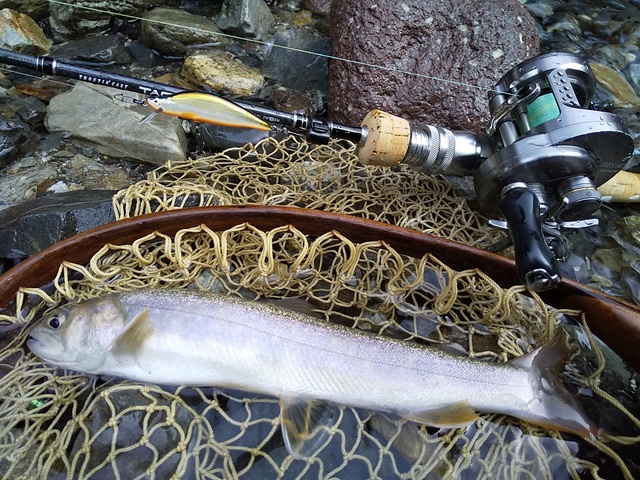 上記写真の33センチの細長いイワナが釣れました!