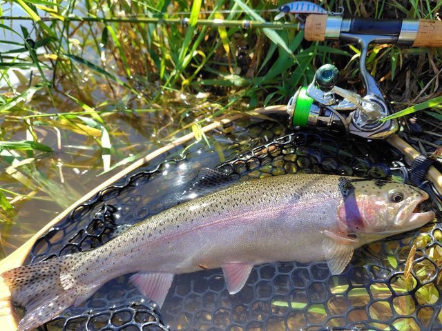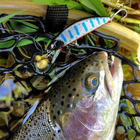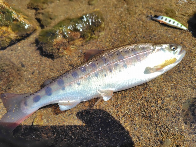 メテオーラでじっくり探るとヒット!小さいけどとても綺麗なヤマメが釣れました!