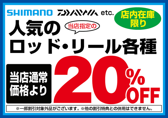 セール期間中、シマノ、ダイワetc.当店指定単品11,000円(税込)以上のロッド&リールが当店通常価格よりレジにてさらに最大20%OFF!!