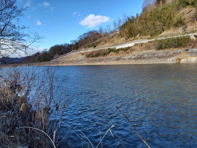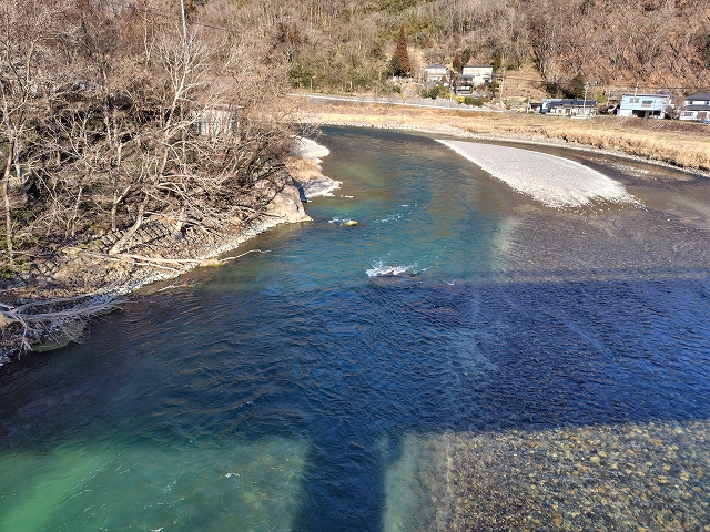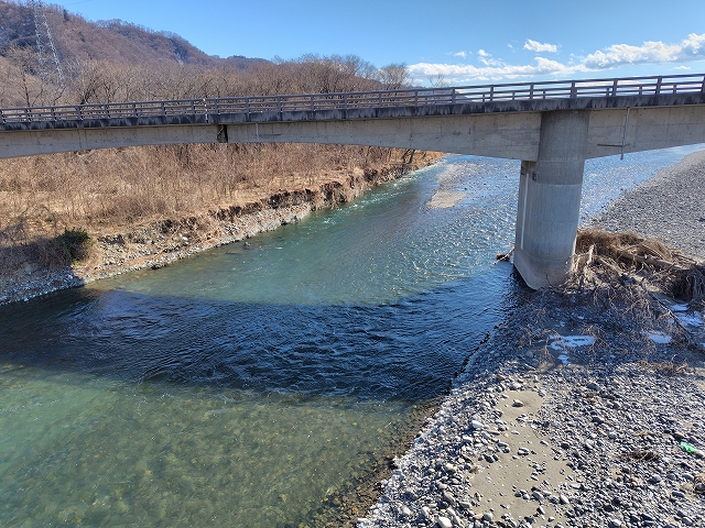 ここも大きく曲がった流れが開けるポイントで、すぐ下流の生坂ダムから差してくる魚にも期待できます。
