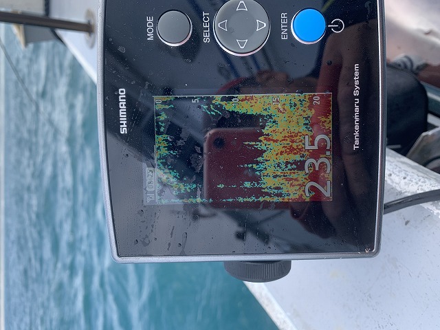 専用仕掛をセットして、探見丸の画面を見てベイトの反応を探って行くと、幸先よくベイトがつき、そのままボトムまで落とし込んでいきます。