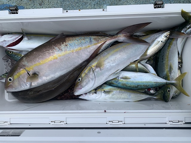 前半戦だけでクーラーBOX内は、賑やか!!カンパチやイナダ(ワカシ中心)、イサキやアジ、など美味しい魚も釣れて大満足な前半戦でした。