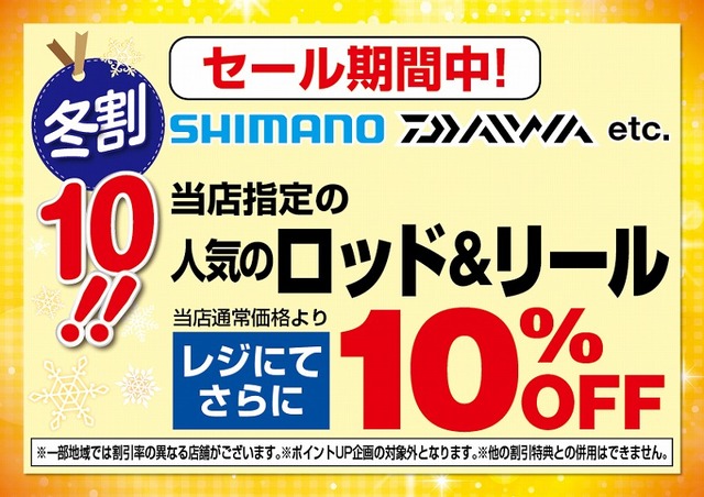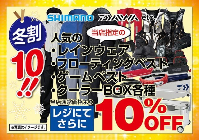 冬割10!!セール期間中、シマノ、ダイワetc.当店指定のレインウェア各種、フローティングベスト各種、ゲームベスト各種、クーラーボックス各種などが当店通常価格よりレジにてさらに10%OFF!