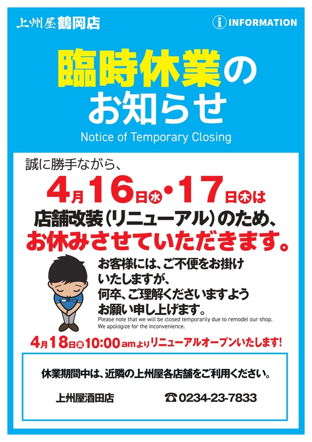2025年3月16日セール・イベント 4月18日リニューアルオープン!! 緊急告知!! 4月18日(金)10時 鶴岡店リニューアルオープン! 詳細は後ほど…乞うご期待!! 16~17日はお休みします。 出典: 上州屋からのお知らせ ・会員証機能を搭載!お買い物や釣りの準備がもっと便利になる上州屋“公式”アプリ登場!・【上州屋メンバーズカード】毎月5の付く日と30日(5日、15日、25日、30日)はポイントアップデー!