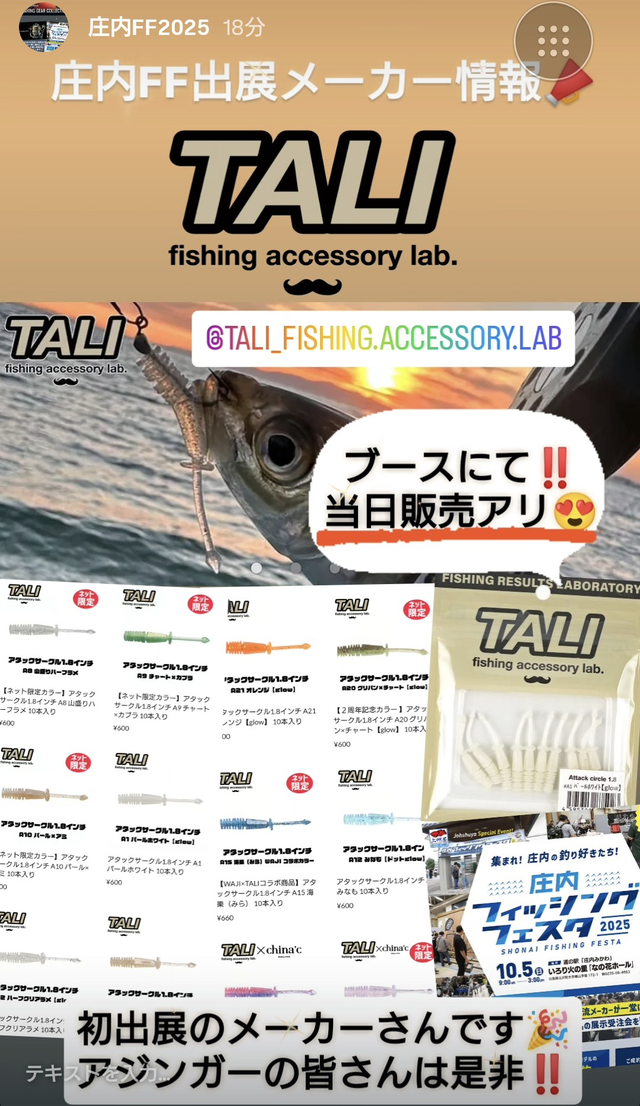 2025年9月20日セール・イベント 庄内FF出展メーカー[TALI] TALI出展情報! 庄内FF初出展のLTゲームメーカー TALI(タリ)当日はブースにて アタックサークル1.8” を販売します!! 興味ある方は是非ブースへ! 上州屋からのお知らせ ・会員証機能を搭載!お買い物や釣りの準備がもっと便利になる上州屋“公式”アプリ登場!・【上州屋メンバーズカード】毎月5の付く日と30日(5日、15日、25日、30日)はポイントアップデー!