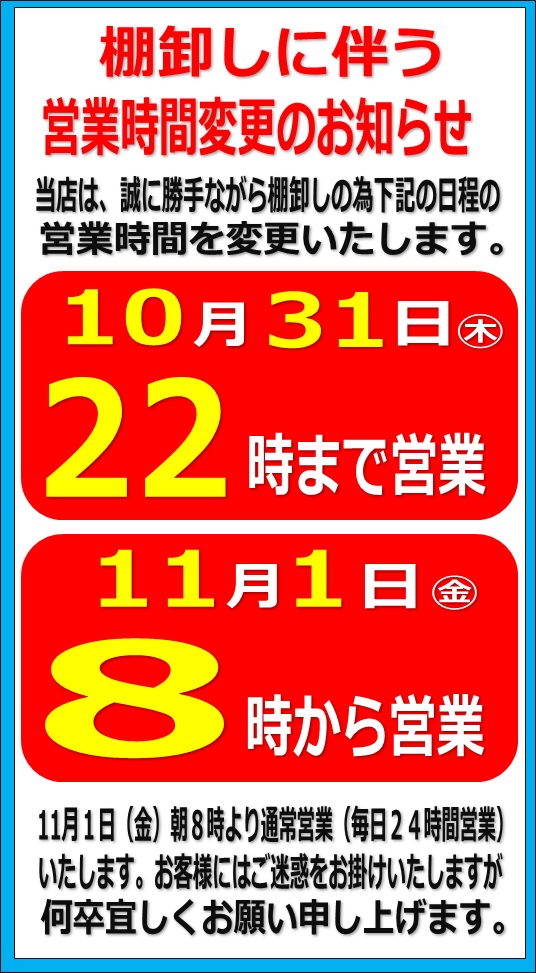 棚卸しに伴いまして。10/31は22時までの営業。11/1は8時から営業となります。ご理解の程宜しくお願い申し上げます。